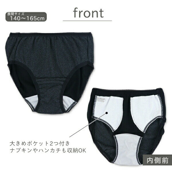 おすすめカテゴリー ジュニア向けサニタリーショーツ 履きやすい黒杢地 内側前に大きいポケット2コ付きで 予備ナプキンやカイロなど 用途に合わせて持ち運べてとっても便利♪
