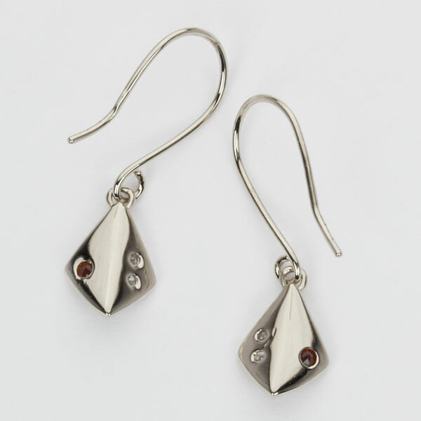 ひし形の鏡面に仕上げたホワイトゴールドに、ダイヤモンドとガーネットが煌めいて揺れるフックピアスです。