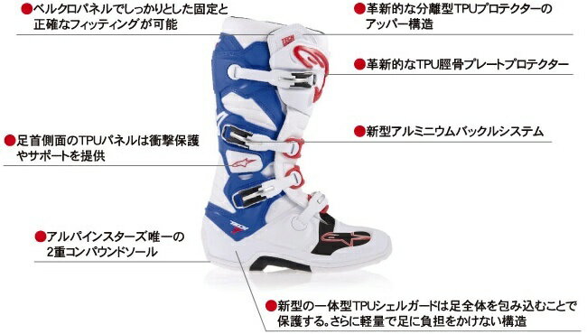 機能性の高いラバーグリップパターンを採用し優れた耐久性とフィーリングを提供・正面のプロテクション部分は、dual closure systemを採用し内部のマイクロファイバーフラップとベルクロが正確なフィット性を提供・曲線状のふくらはぎプロテクタープレートは、高弾性高分子を射出成型で成型し、耐衝撃性に優れる・ブーツのふくらはぎから下部分はTPUアンクルプロテクションシステムを採用し、ねじれの力を抑制、足首のダメージを防ぐ・衝撃に強いアルミのアーチ型の締め具と、self-aligning設計のクイックリリース/ロックシステムを採用した革新的なバックルシステムは、簡単で正確なロックと、高いライディングパフォーマンスを提供・甲の部分とアキレスアコーディオンフレックスゾーン構造が、快適性、コントロール性、サポート性を提供・広いマイクロファイバーゲートルが水や泥の浸入を防ぐ・取り外し可能のインソール■注意点※Alpinestarsは、ヨーロッパ仕様のアパレルの為、サイズは目安となります。