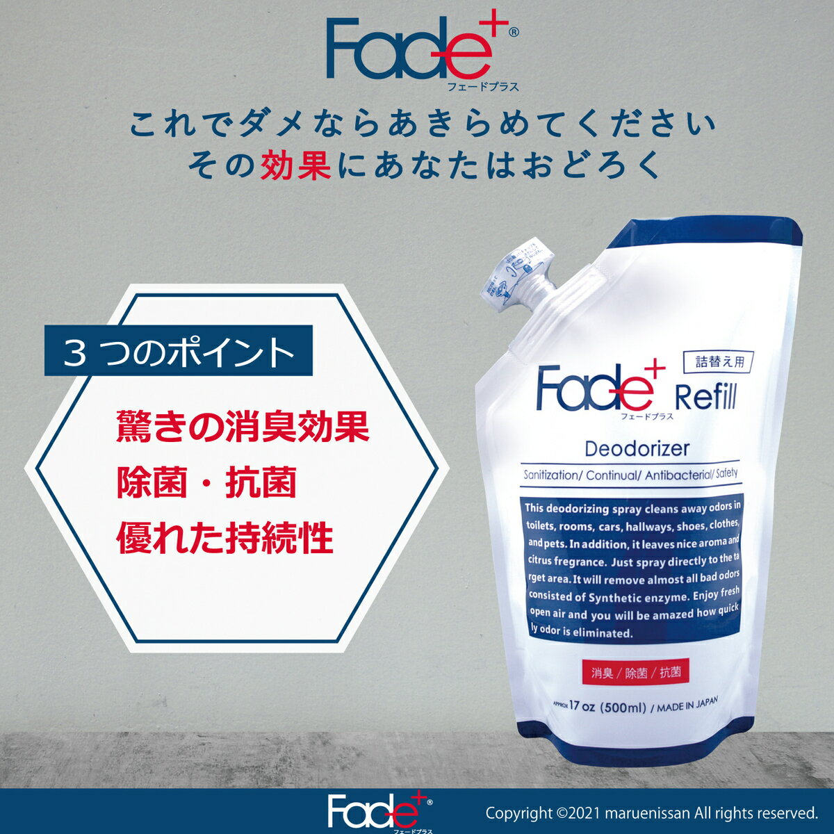 Fade+ フェードプラス 消臭スプレー 詰め替え 部屋 空間 靴 トイレ 車 ペットのおトイレ臭 消臭 除菌 抗菌 アンモニア臭 体臭 汗 足 衣類 ファブリック キッチン 無香料 人工酵素 日本製 500ml 丸栄日産 販売元